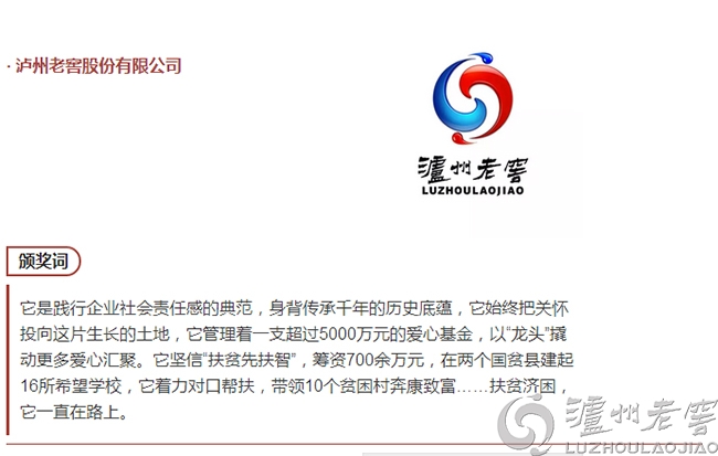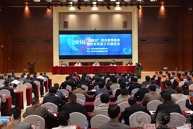 10月13日, 2016年“扶貧日”四川系列活動暨社會扶貧工作推進會在成都召開。現場公布了2015扶貧日公募情況及非定向資金使用情況,揭曉了第二屆“四川十大扶貧好人”暨首屆“四川十大扶貧愛心組織”評選表彰活動獲獎名單。瀘州老窖股份有限公司憑借在扶貧事業上的突出貢獻,榮獲首屆“四川十大扶貧愛心組織”稱號,公司黨委書記、董事長劉淼代表公司接受表彰。